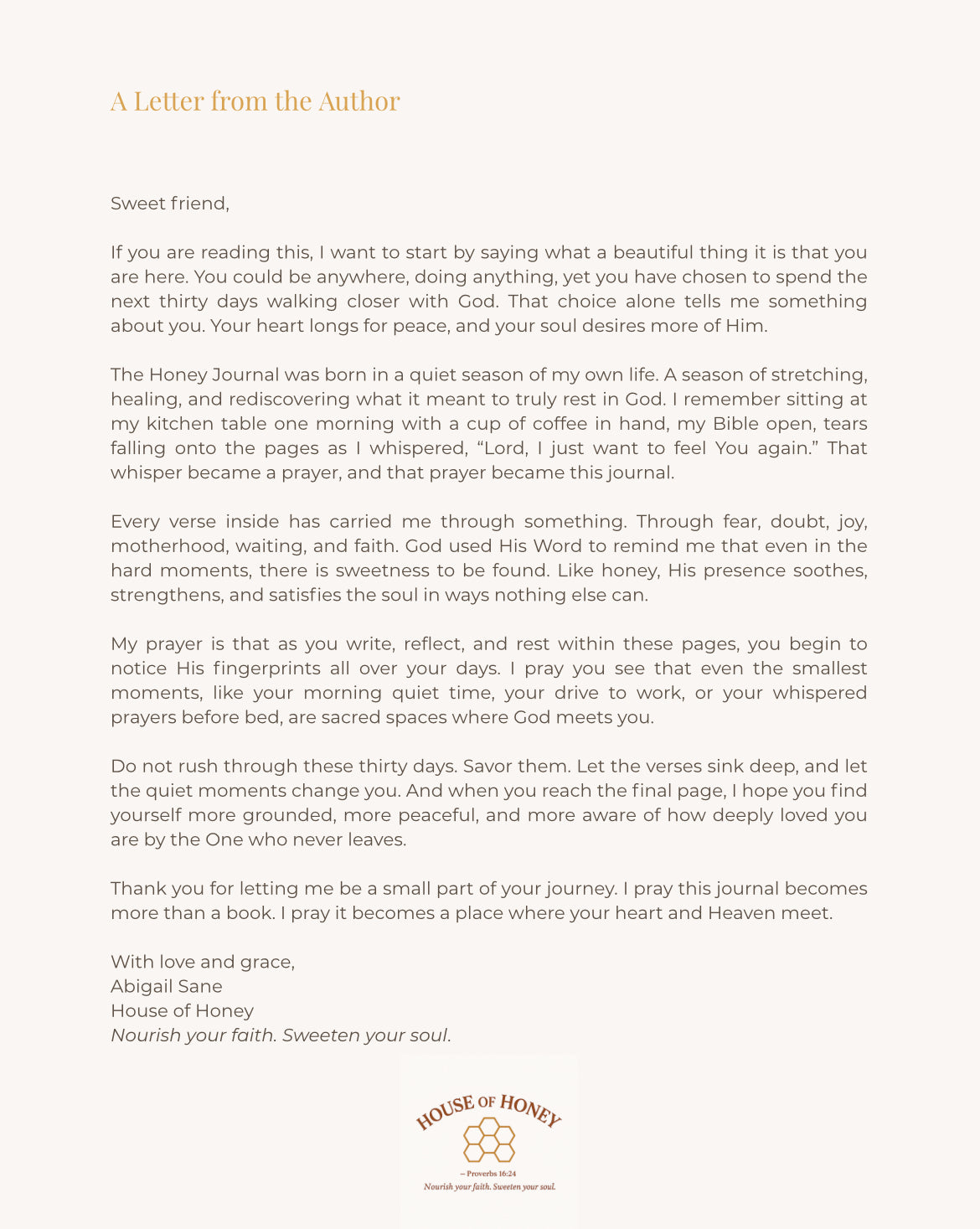 The Honey Journal is a 30-day guided faith journal designed to help you spend intentional time in Scripture, prayer, and gratitude. Each day invites you to slow down, write, and rest in God’s presence — one verse, one prayer, and one moment of thankfulness at a time.